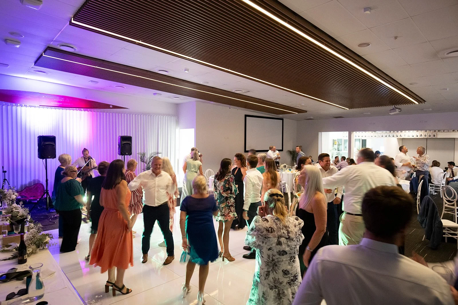 Our venue is fully equipped with air conditioning, a laser projector with large screen, three plasma monitors, two cordless microphones, and audio throughout indoor and outdoor areas. Included are 200 chairs, 20 round tables, bar tables, stools, and plants. Dance floor options are available — timber ($450) or white gloss ($850) — with exclusive venue hire Monday to Saturday.